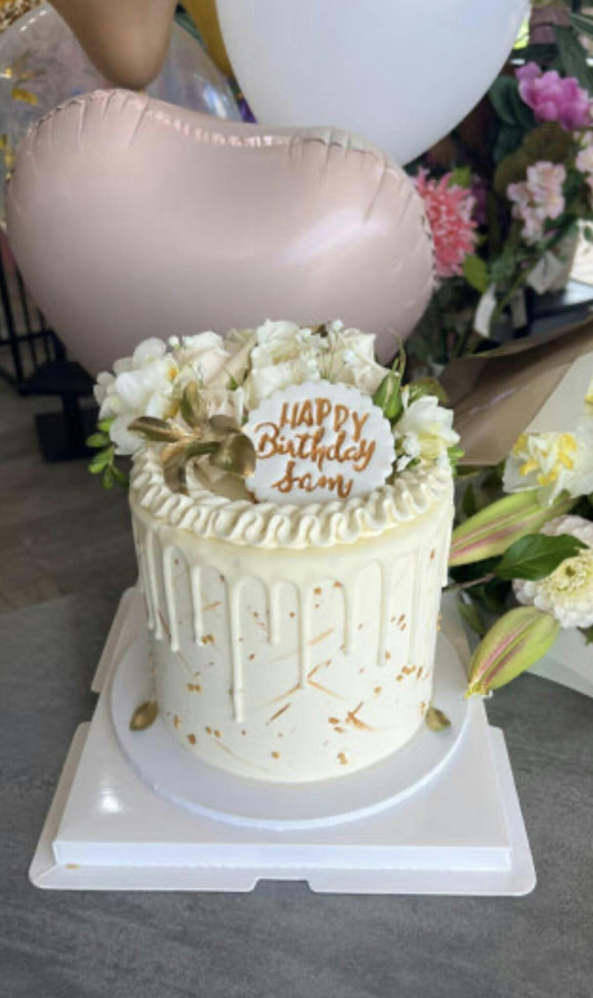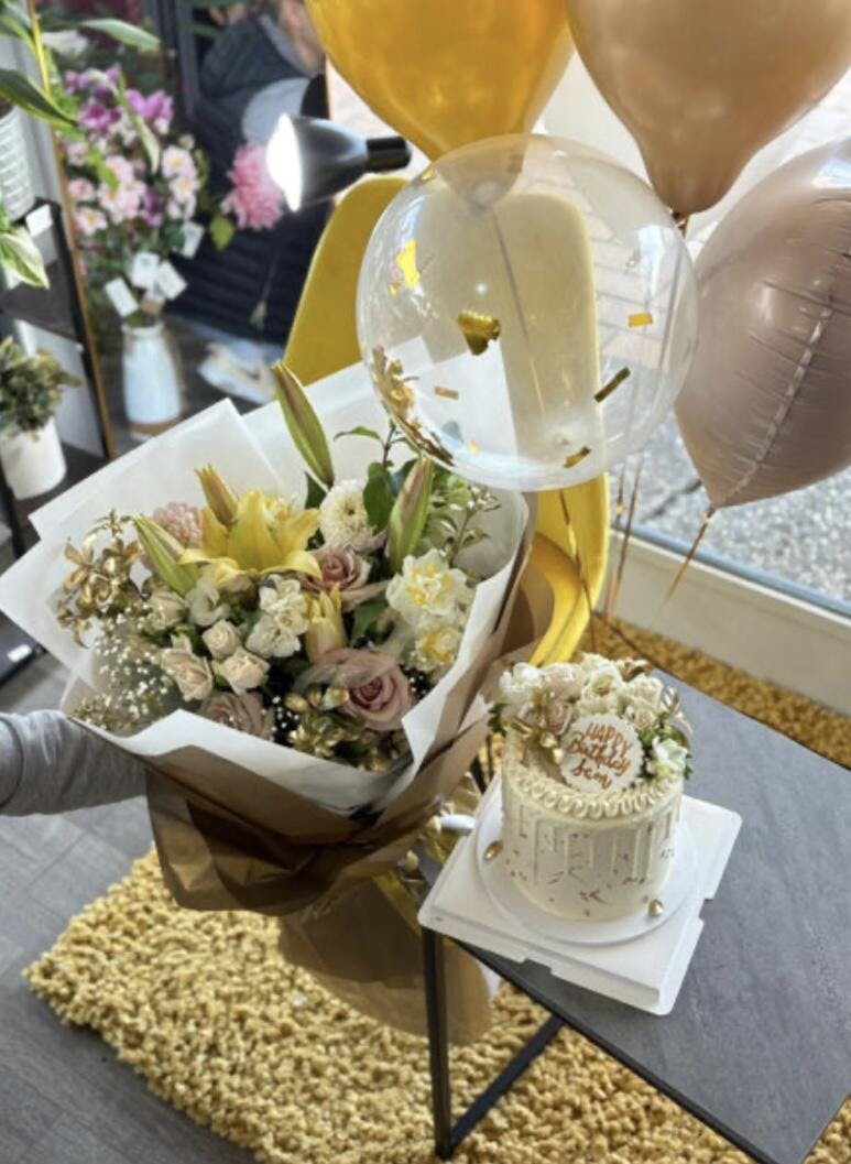 This delightful bundle includes a stunning floral bouquet, a delicious cake with a customisable cake topper featuring any message of your choice, and vibrant balloons to create the perfect centrepiece for your festivities. Ideal for birthdays, anniversaries, or just because, this set adds joy and beauty to every celebration.